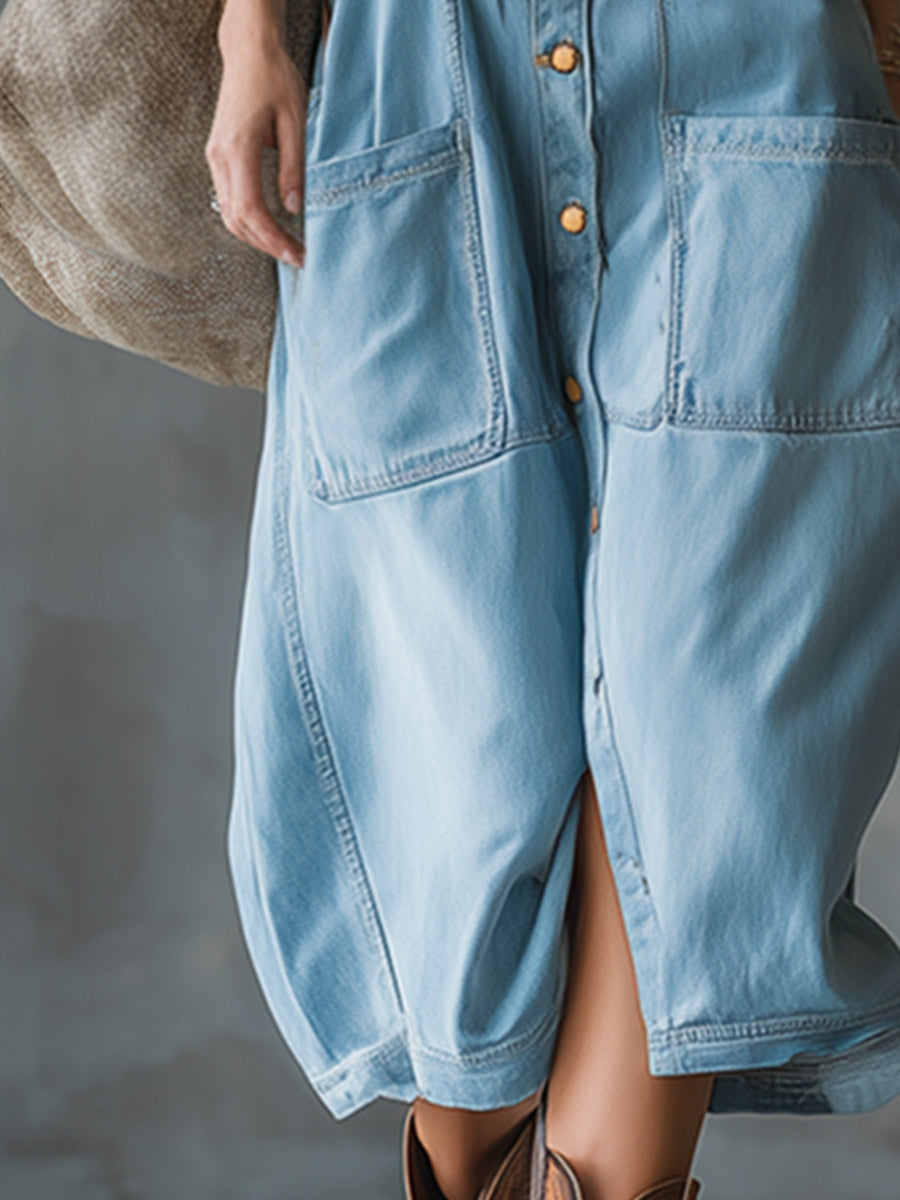 Vintage Elegant Suspender Blue Denim Front Button Square Neck Sleeveless Midi Dress
